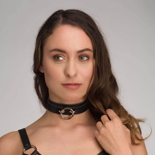 Das Lederhalsband INSOLENCE ist Teil der hochwertigen Luxe Bondage Collection von VoyeurX. Dieses Halsband ist an der Front mit einem klassischen O-Ring ausgestattet, der im Unterschied zu vielen anderen Modellen allerdings von zwei seitlichen Metall-Ösen an Ort und Stelle fixiert wird. So ermöglicht der Ring eine relativ starre Fixierung an einer Leine oder Kette mittels Karabiner. Das Halsband aus Echtleder in klassischem Schwarz ist bei diesem Modell bewusst schlicht und relativ schlank gestaltet. So verbindet es sich zum Beispiel optisch elegant mit einem Lederharness oder anderen Teilen eines Fetisch-Outfits. Die schlanke Form betont auch den femininen Charakter und eignet sich daher besonders gut für Frauen.